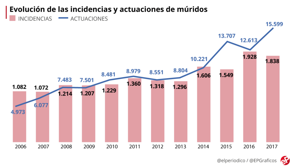 En julio pasado se anunció un aumento de presupuesto y se dobló literalmente el operativo hasta noviembre, pasando a 10 equipos de dos personas, que sumaban 20 técnicos-operadores a pie de calle. Las incidencias habían aumentado a partir del 2016 y el reto era controlar las situaciones más agudas incrementando visitas y puntos de control; vigilar los puntos de riesgo de plagas buscando evidencias de múridos antes de que generasen molestias (tanto en superficie como en la red de alcantarillado); y dar respuestas a esas incidencias ciudadanas que suelen alertar de su presencia. Cada año se gestionan más de 1.600 avisos de ratas y ratones, mientras que se articulan unos 550 planes de actuación. Si en el 2016 hubo 12.500 intervenciones en el terreno, la presión del 2017 se saldó con 15.599, casi el doble que hace menos de una década. No hay datos todavía sobre el 2018, porque la prioridad ha sido actuar a cada demanda ciudadana registrada, puntualizan.