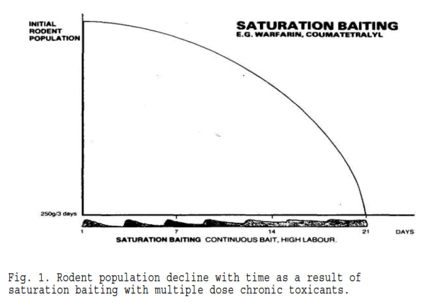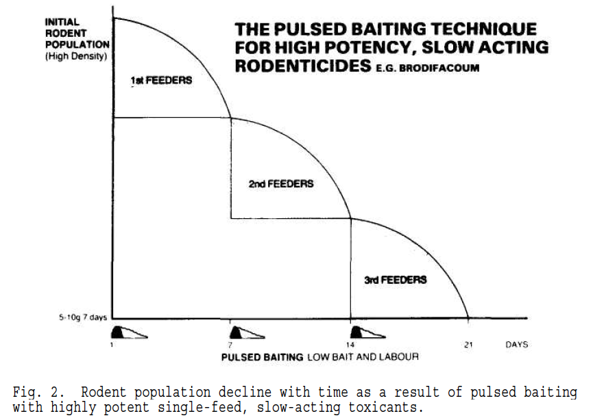 –> Adrian C. Dubock . 1982. Pulsed baiting. A new technique for high potency, slow acting rodenticides. Proceedings of the Tenth Vertebrate Pest Conference, University of California, pp. 123-136.